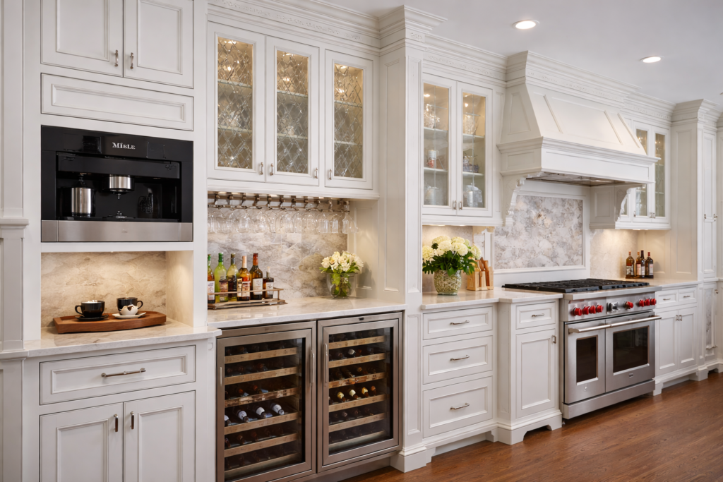 We work with premium materials such as quartz, natural stone, and custom wood cabinetry to ensure durability and visual impact. Elements like built-in coffee stations, wine storage, and integrated lighting are designed to feel like part of the architecture rather than afterthoughts. Every component is chosen to enhance both the look and the longevity of your kitchen.